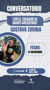 Te invitamos mañana, 13/11 18:00h, a participar del conversatorio que va a estar a cargo del creador de “Manos Argentinas” Gustavo Zuviria, en La Rioja.